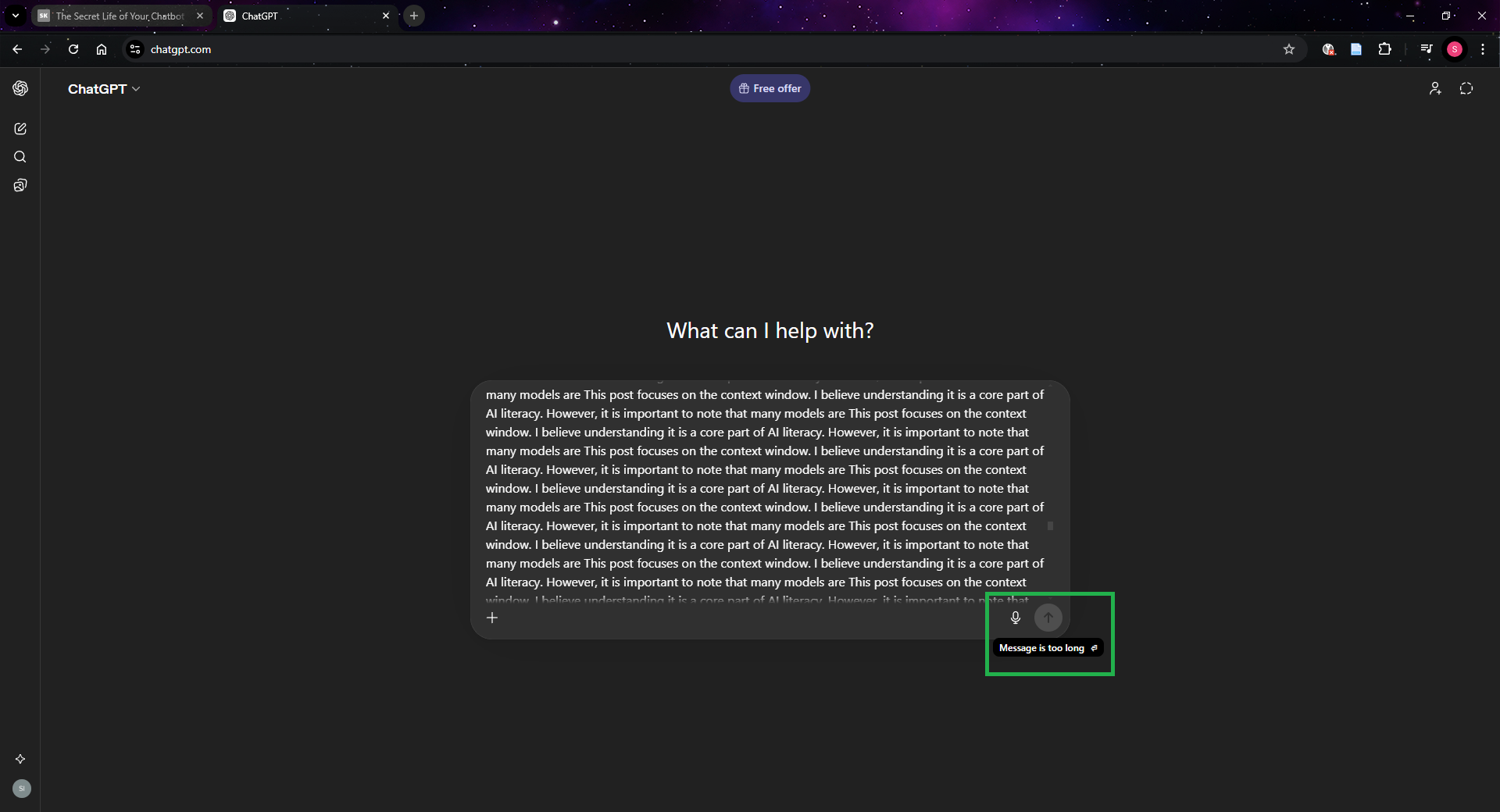 But how do we know the context window exists? Well, aside from reading technical documentation, you can test it yourself. Try pasting massive amounts of text into a chatbot and you will encounter an error telling you that the input is too long. Some chatbots may not even allow you to press send.