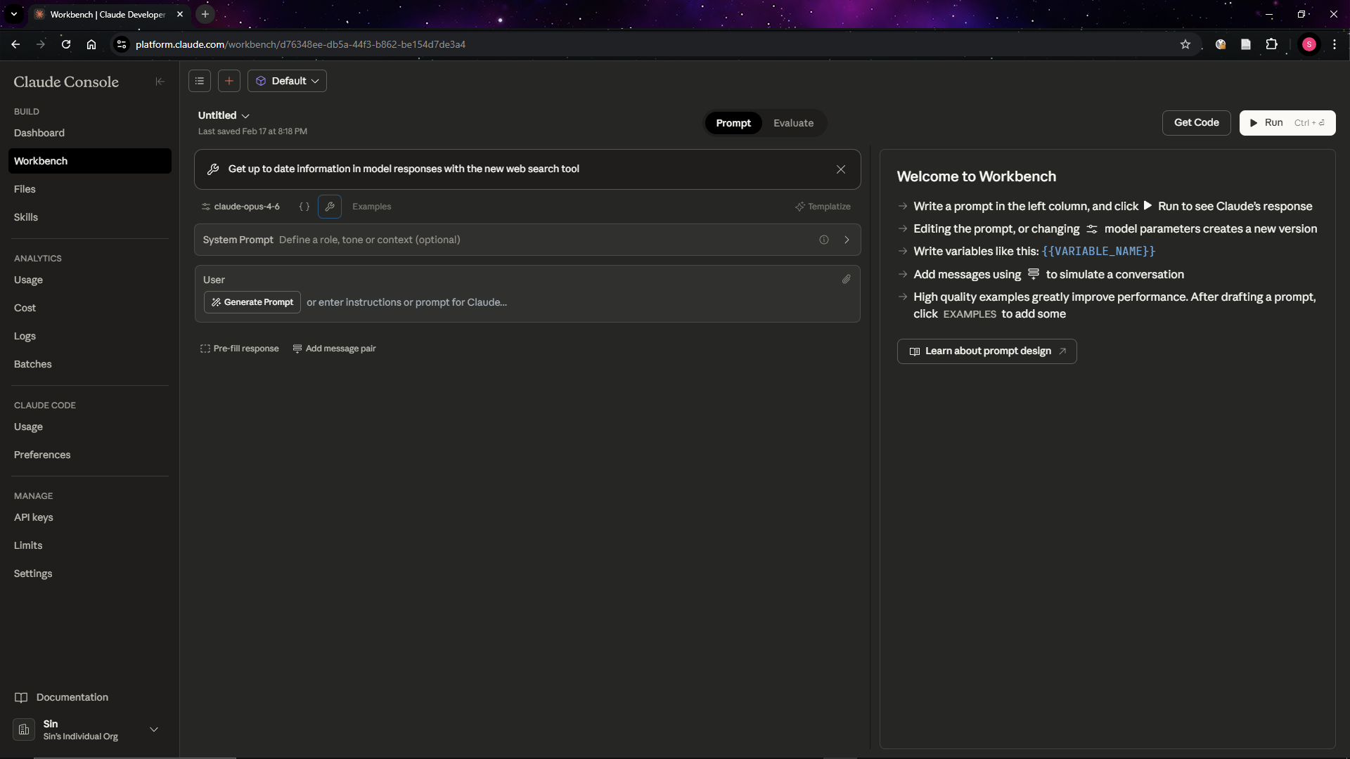 Anthropic Console (console.anthropic.com) provides a workbench for Claude models.