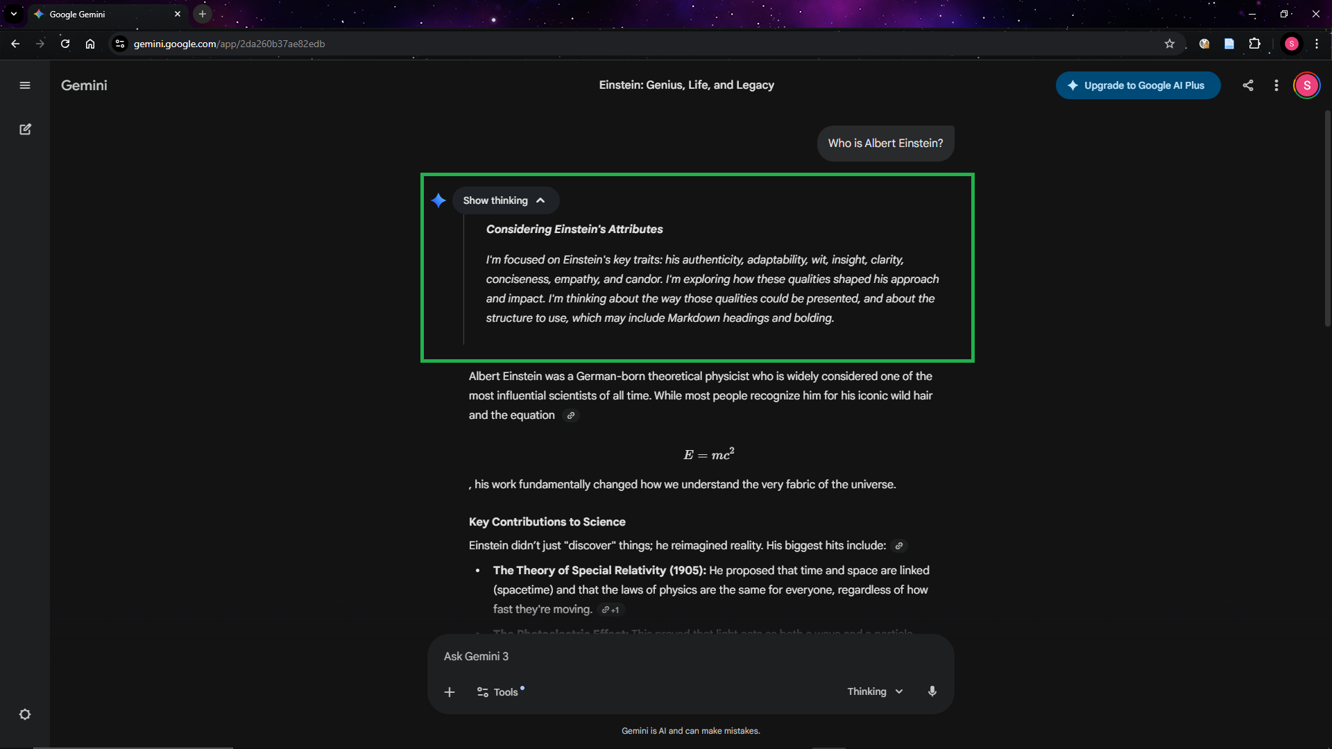 The below screenshot highlights the reasoning/thinking process that the model has before providing an answer.