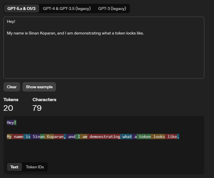 The example below shows how OpenAI’s tokeniser breaks a sentence into individual tokens, each highlighted in a different colour. You can experiment with OpenAI’s tokeniser yourself to get a feel for how text is split into tokens.